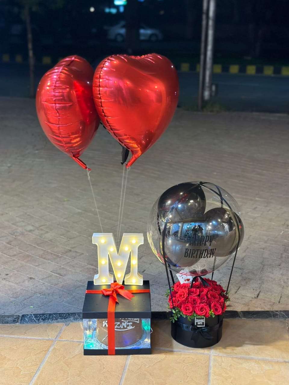 This beautiful gift includes shiny heart balloons, a rose flower box, and a neatly packed cake. Ideal for birthdays and special celebrations.