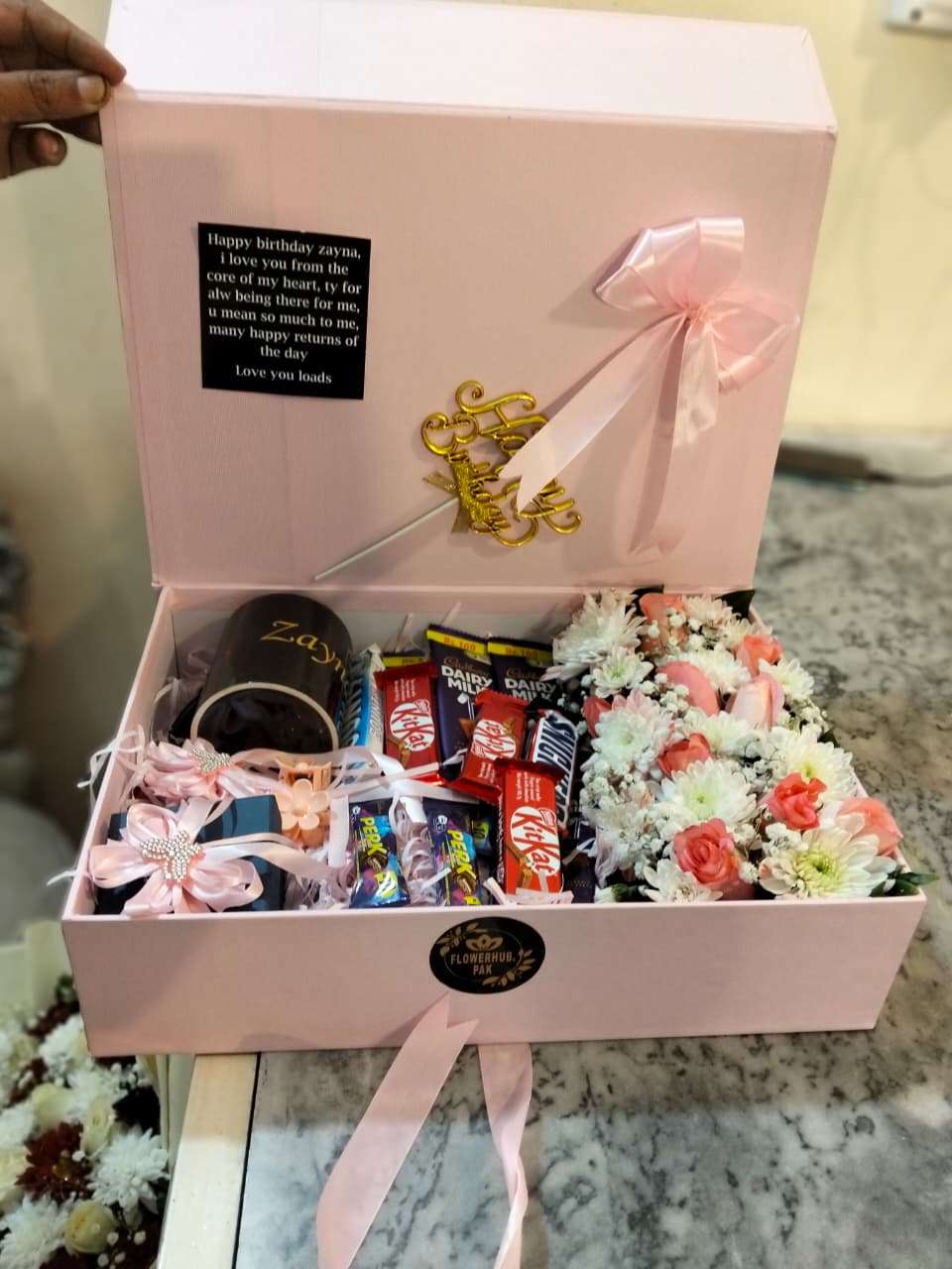 An elegant birthday hamper featuring soft pink florals, delicious chocolates, a personalized mug, and charming gift items—presented in a reusable keepsake box with a heartfelt note inside.