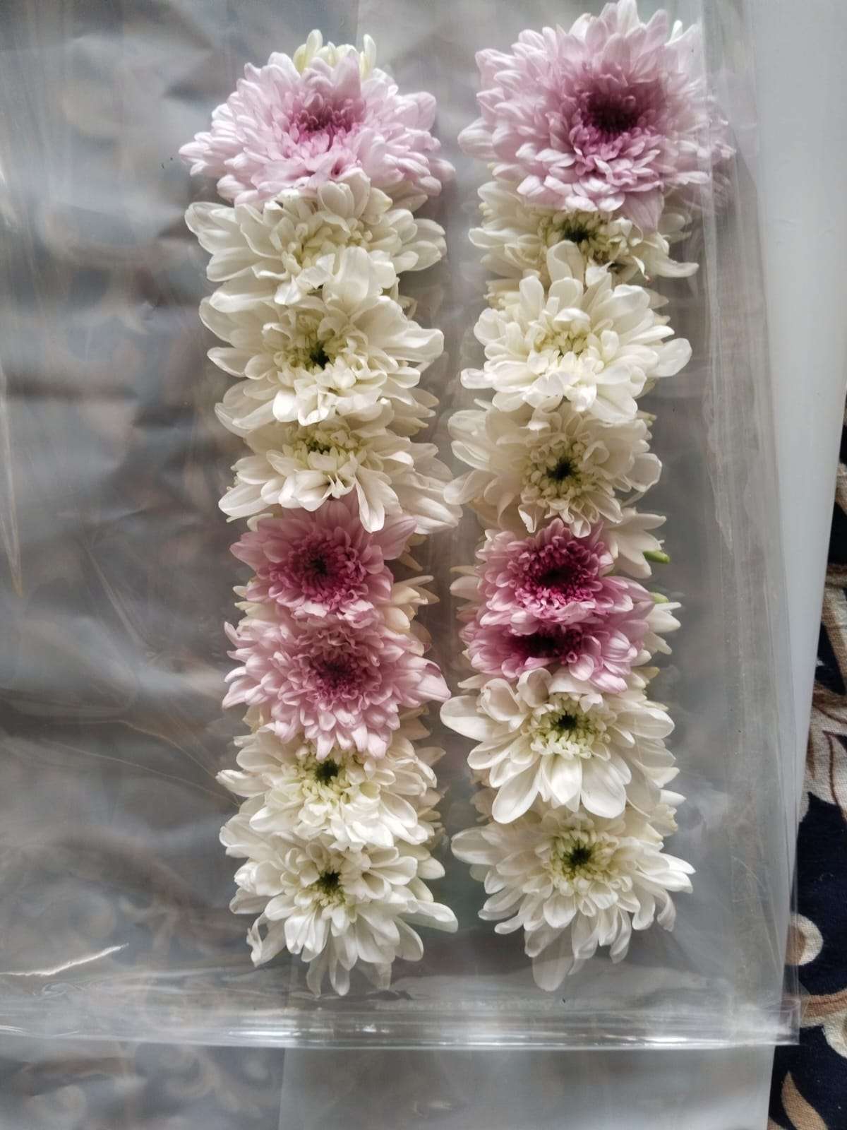 This graceful gajra features a soft blend of blush pink and ivory white chrysanthemums. Each bloom is carefully arranged to create a full, elegant, and balanced look. The gentle pastel tones symbolize purity, love, and new beginnings. Perfect for weddings, nikkah ceremonies, engagements, and traditional celebrations.