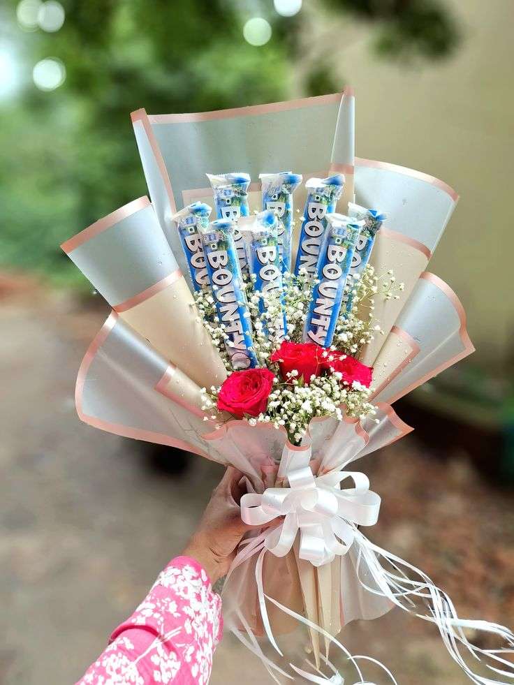 Delight your loved ones with our Bounty Chocolate Rose Bouquet, a perfect blend of sweetness and elegance. This beautifully hand-crafted bouquet features premium Bounty chocolate bars, paired with fresh red roses and delicate baby’s breath flowers, all wrapped in soft pastel luxury paper and finished with an elegant ribbon bow.