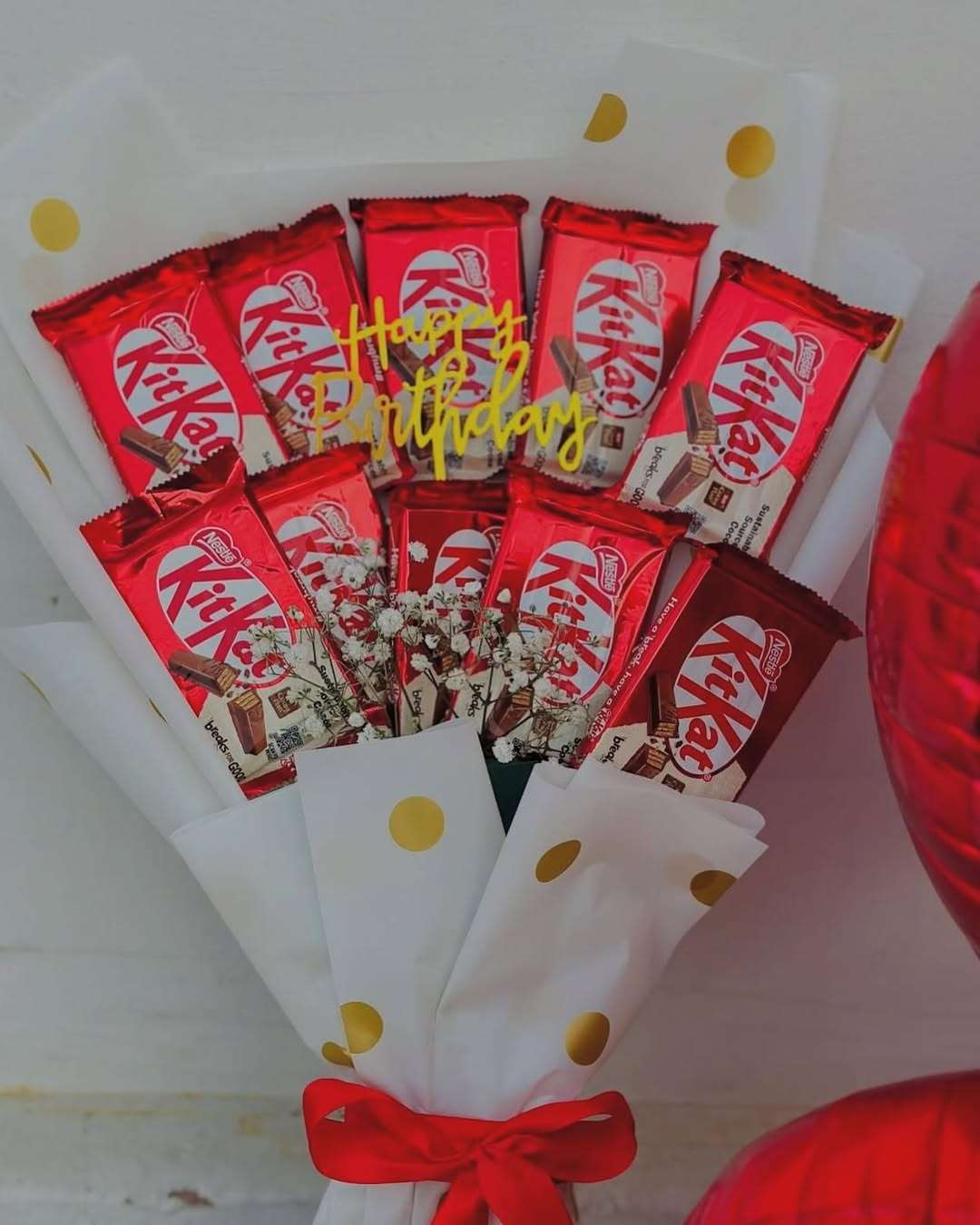 A fun and delicious twist on traditional flowers! This handcrafted KitKat chocolate bouquet is beautifully wrapped in premium white polka-dot paper, finished with a bold red ribbon and a cute “Happy Birthday” topper. Perfect for chocolate lovers and birthday surprises.