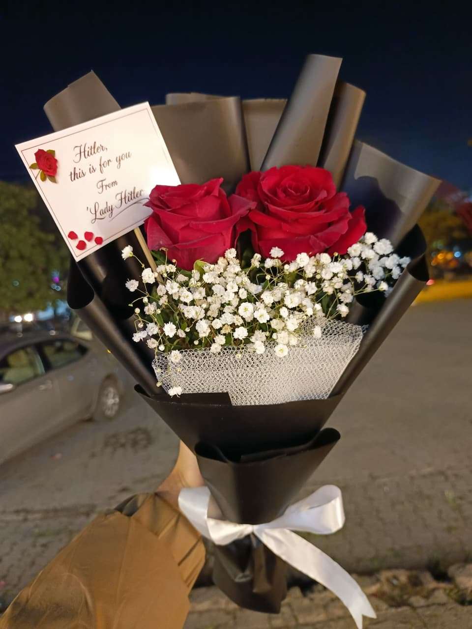 Express your feelings with our Classic Love – 2 Red Roses Bouquet, a timeless symbol of love and affection. This elegant hand-tied bouquet features two premium fresh red roses, beautifully paired with delicate white baby’s breath (gypsophila) and wrapped in luxury black matte wrapping, finished with a neat white ribbon.