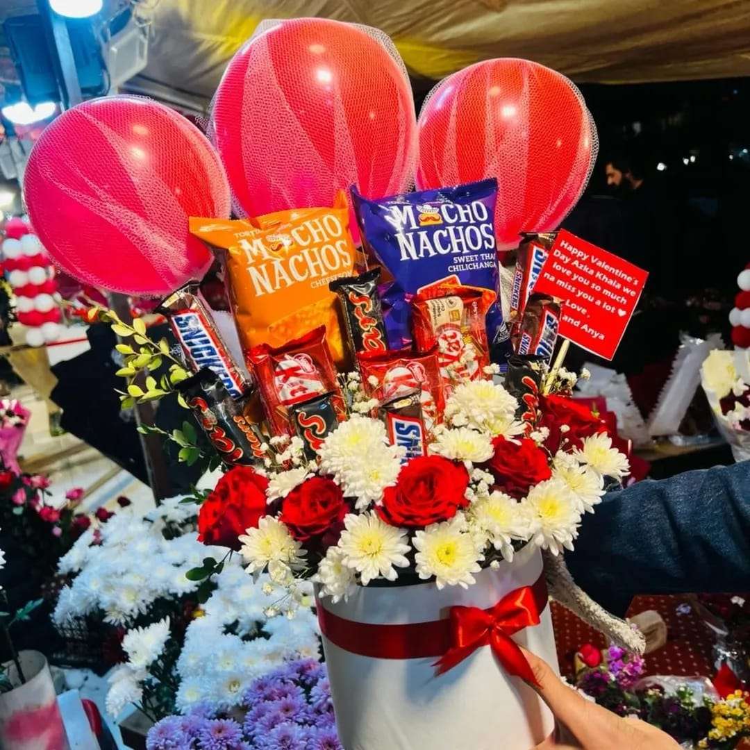 Cake (freshly baked), flowers (e.g., heart-shaped rose box), and a plush teddy bear, creating an unforgettable romantic gesture.