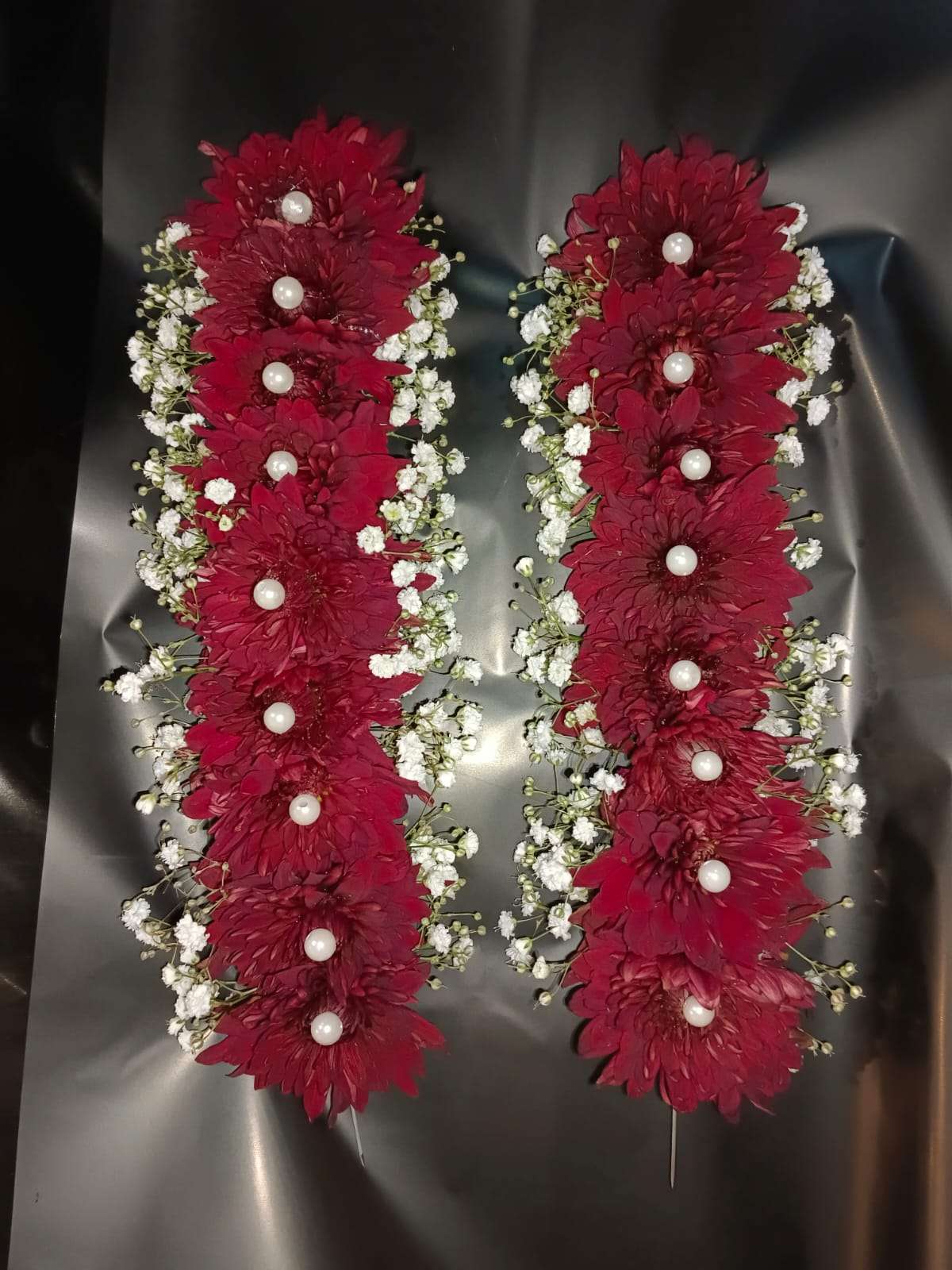 Rich red chrysanthemum flowers adorned with pearl accents. Soft white baby’s breath adds elegance and contrast. Ideal for bridal, mehndi, and formal celebrations. Handcrafted fresh for a luxurious traditional look.