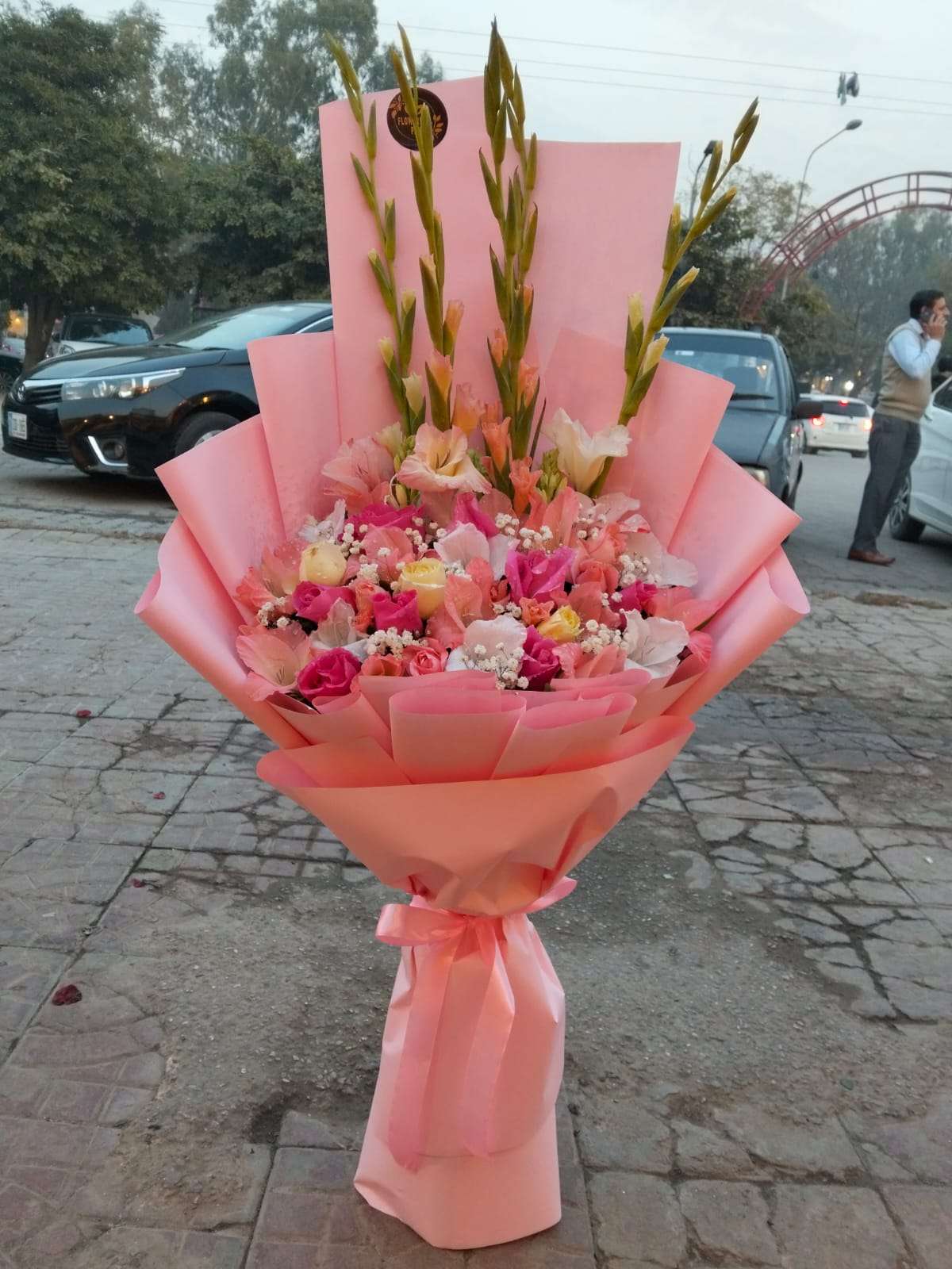 The Elegance Bouquet is a graceful floral arrangement featuring tall gladiolus stems rising above a lush base of pink, peach, and cream roses, complemented with soft filler blooms and baby’s breath. Wrapped in premium pastel pink wrapping and finished with a matching ribbon, this bouquet creates a stunning vertical look with a soft, romantic charm.