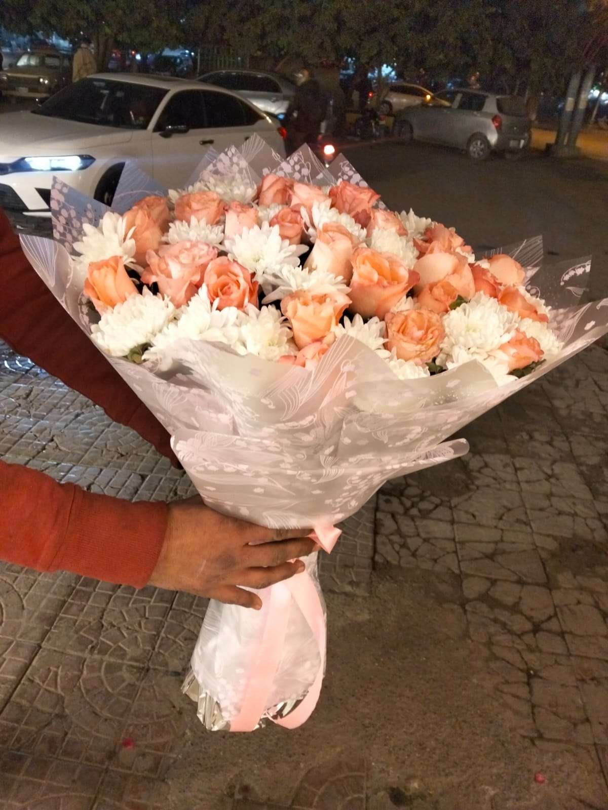 Bring elegance and warmth to any occasion with our stunning peach and white rose bouquet. This exquisite arrangement combines soft peach-colored roses with pristine white chrysanthemums, creating a harmonious blend of colors that exudes grace and sophistication. Beautifully wrapped in premium white patterned paper and finished with a delicate pink ribbon, this bouquet is perfect for anniversaries, engagements, congratulations and romantic gestures. Each stem is hand-selected by our expert florists to ensure maximum freshness and beauty.