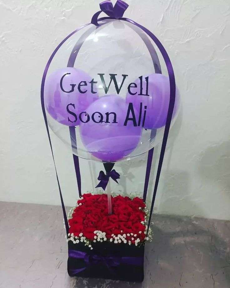 Send heartfelt wishes with this elegant Personalized Get Well Soon Rose & Bubble Balloon Box. The arrangement features a clear bubble balloon customized with the message “Get Well Soon Ali”, filled with soft purple balloons and finished with premium purple ribbons.