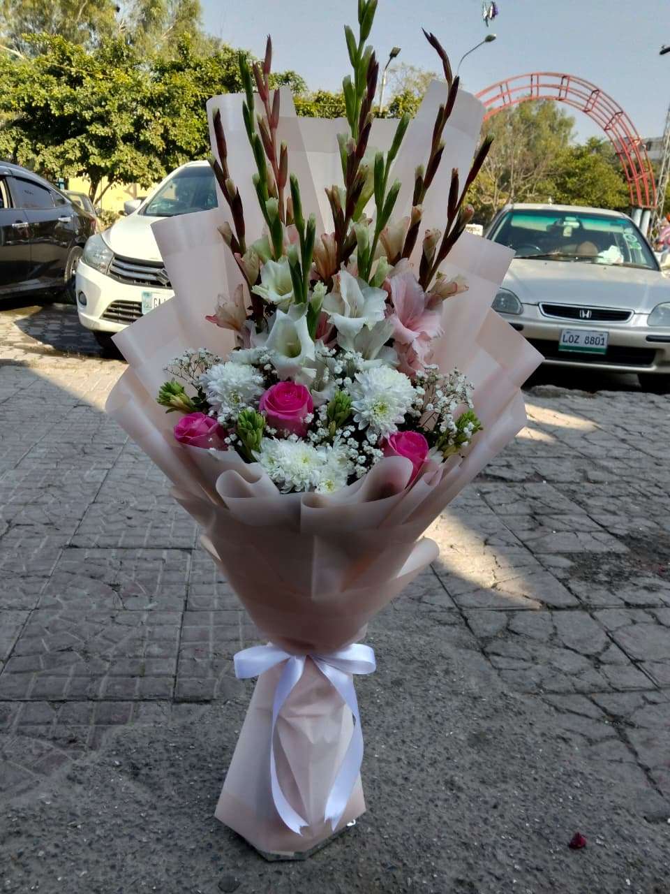 This Elegant Pastel Bouquet features tall gladiolus stems beautifully arranged with soft pink roses, fresh white chrysanthemums, and delicate baby’s breath. Wrapped in premium pastel-toned paper and finished with a graceful white ribbon, this bouquet offers a perfect balance of height, freshness, and elegance.