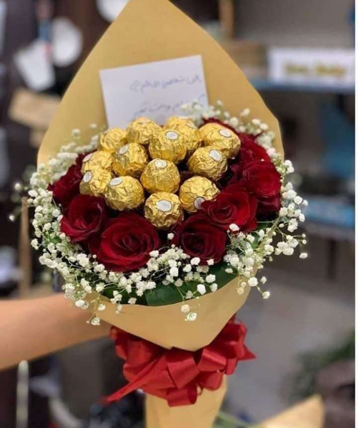 A breathtaking arrangement of premium Ferrero Rocher chocolates nestled among fresh red roses and delicate baby’s breath. Wrapped in elegant gold tones and finished with a rich red bow—perfect for romantic gestures and special celebrations.
