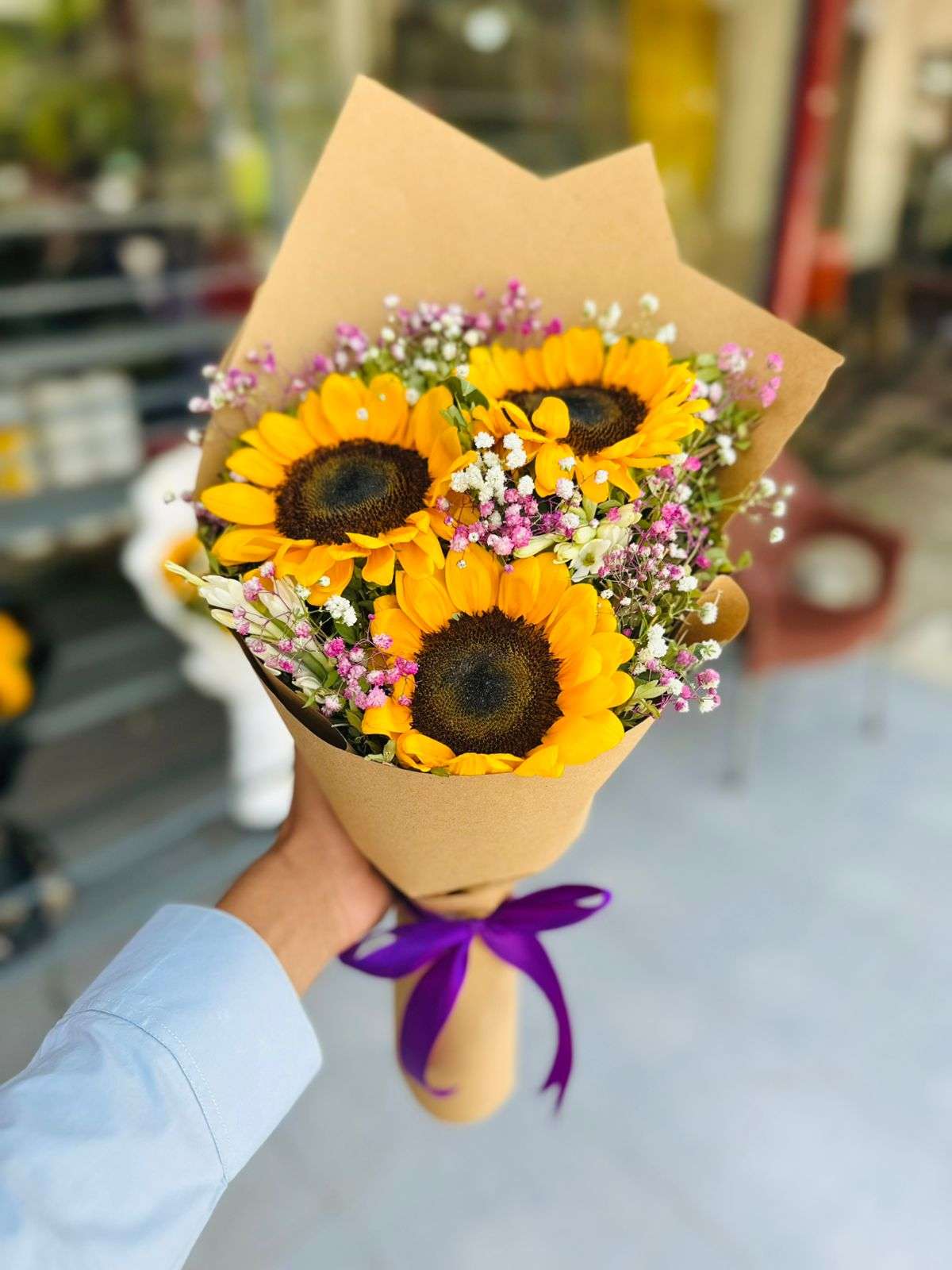 The Golden Sunshine Bouquet is a bright and joyful arrangement featuring fresh sunflowers paired with delicate baby’s breath and seasonal fillers. Wrapped in elegant kraft paper and finished with a charming ribbon, this bouquet brings warmth, positivity, and happiness to any moment.