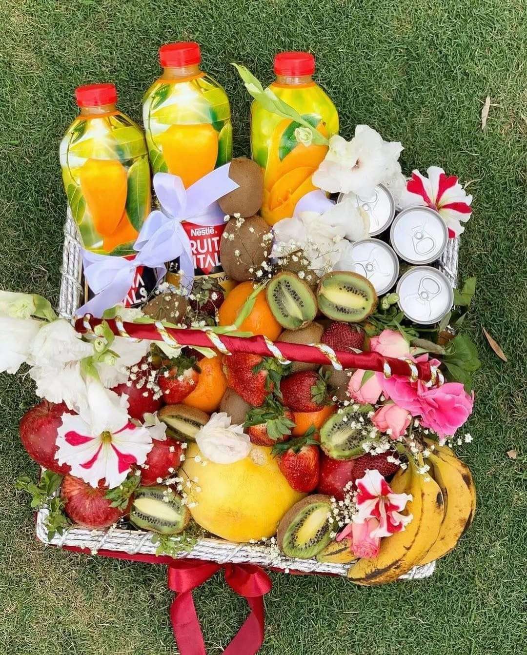 The Imperial Harvest Grand Fruit Basket is a magnificent display of abundance and luxury, making it an extraordinary gift for special recovery wishes or celebratory gestures. This oversized, silver-toned woven basket is overflowing with a premium bounty of fresh, vibrant fruits, including lush strawberries, sliced kiwi, bananas, and crisp apples. The arrangement is beautifully accented with delicate white gladiolus and deep pink roses, creating a garden-fresh aesthetic. To add a festive touch, the basket includes refreshing beverages like Nestlé Fruit Vital and canned drinks tucked in the back, and is finished with a regal red satin ribbon and a matching wrapped handle.