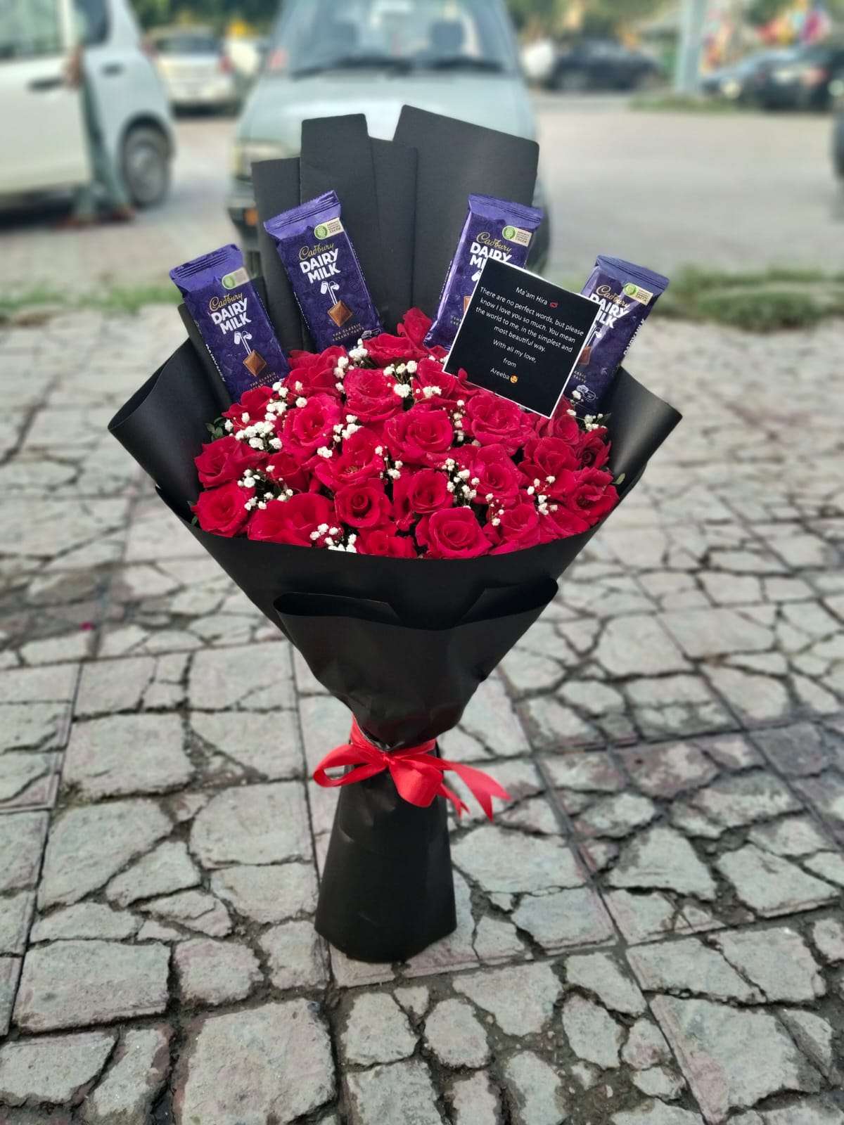 A stunning expression of romance, this elegant bouquet features lush red roses beautifully arranged with Cadbury Dairy Milk chocolates, wrapped in premium black paper and finished with a classic red ribbon. Accented with delicate white fillers and a heartfelt message card, this bouquet blends sweetness and passion—perfect for anniversaries, birthdays, Valentine’s Day, or surprising someone special with love.