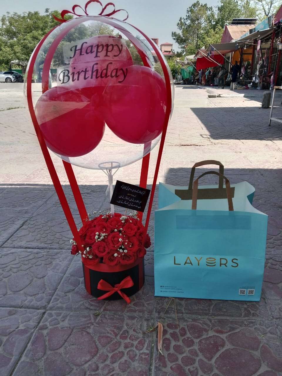 A stunning birthday arrangement featuring a transparent balloon with red balloons and fresh red roses, designed to make birthdays unforgettable.