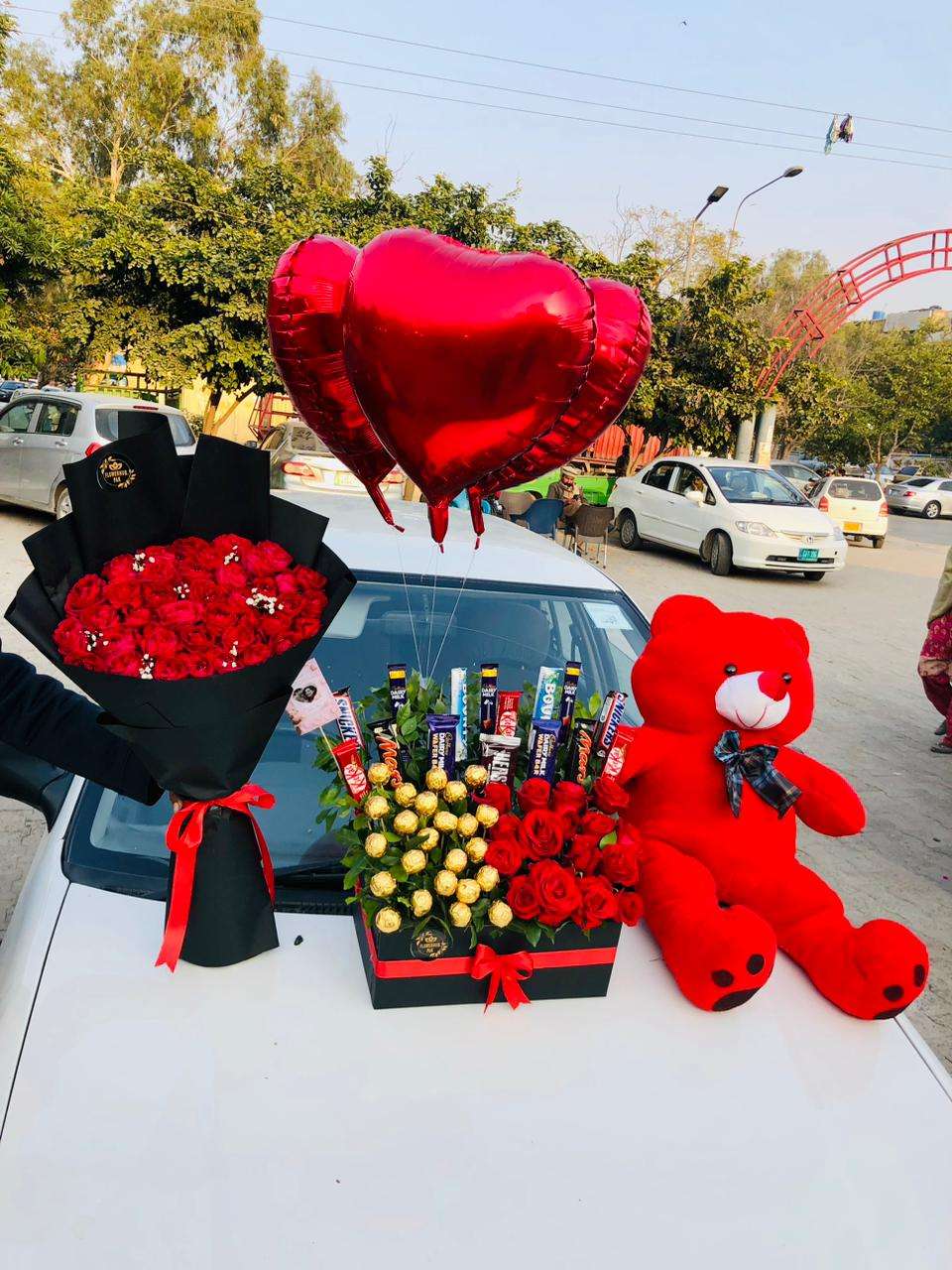Make your loved one feel truly special with this Luxury Love Surprise Gift Hamper, designed to express deep love and romance. This premium combo includes a stunning bouquet of fresh red roses wrapped in elegant black paper, a beautiful box arrangement of red roses paired with Ferrero Rocher chocolates, heart-shaped foil balloons, and an adorable red teddy bear.