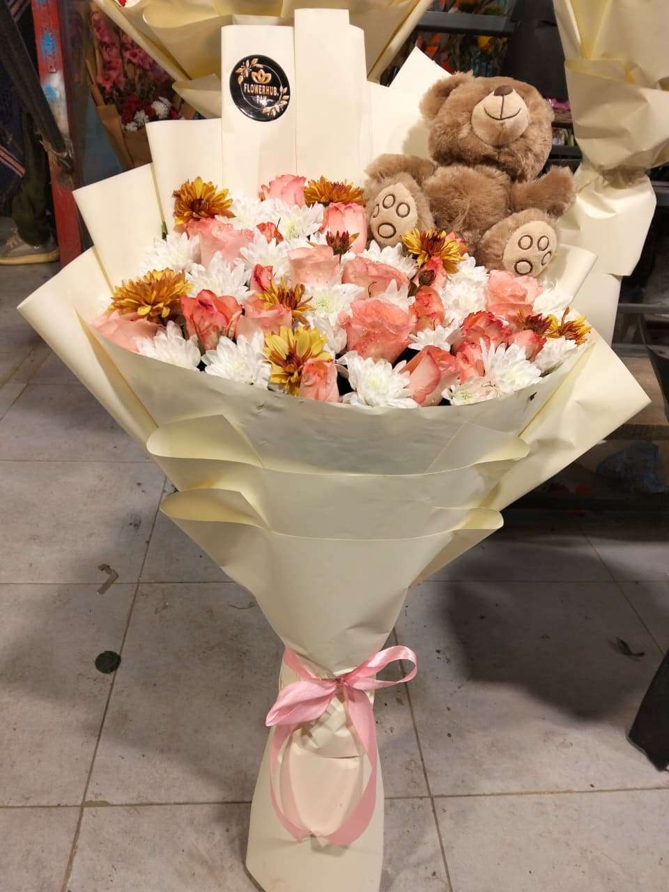 Create the perfect heartwarming gift with our delightful mixed flower bouquet combined with cuddly teddy bears. This enchanting arrangement features a vibrant mix of fresh pink carnations, white daisies and golden yellow flowers, elegantly wrapped in premium white paper with a soft pink ribbon. Accompanied by adorable plush teddy bears, this combo is ideal for birthdays, anniversaries, get-well wishes and celebratory moments. Every arrangement is carefully handcrafted to bring joy and warmth to your loved ones.