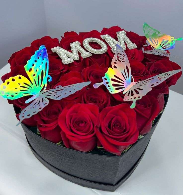 Celebrate unconditional love with this elegant Mom Heart Rose Box. Crafted in a beautiful heart-shaped black box, it is filled with fresh premium red roses, symbolizing deep love and gratitude. The arrangement is enhanced with delicate decorative butterflies and a sparkling “MOM” pearl letter topper, giving it a luxurious and emotional touch.
