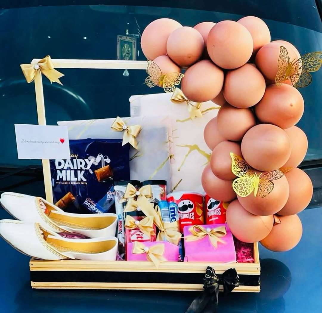 A simple but massive surprise featuring a huge, cuddly pink teddy bear, a matching bouquet of red roses, and a classic wicker basket overflowing with chips and chocolate bars. It’s the perfect combination of cuddles and treats.