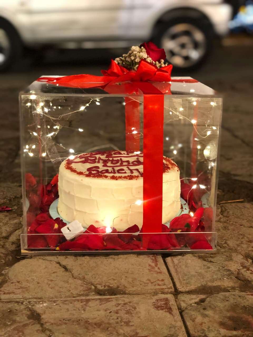 An elegant transparent cake box decorated with glowing lights and rose petals, creating a warm and beautiful celebration setup.