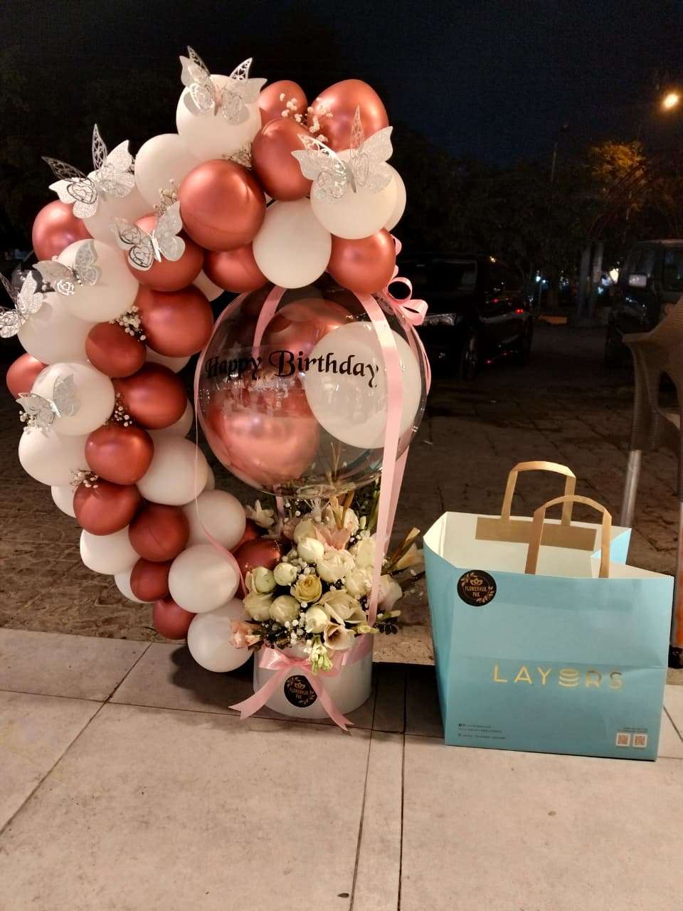Celebrate birthdays in unforgettable style with our Rose Gold Birthday Surprise Box. This luxurious setup features an elegant arch of rose-gold and white balloons adorned with delicate butterfly accents, paired with a transparent “Happy Birthday” balloon and a fresh white floral arrangement at the base. Completed with a premium birthday cake, this gift set creates a stunning visual impact and heartfelt surprise.