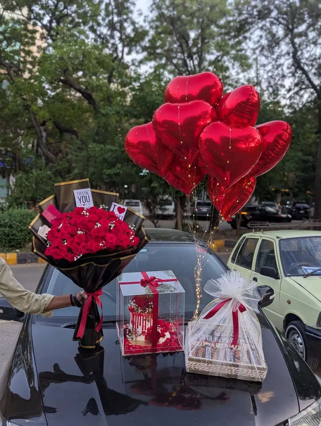 The set also includes a designer celebration cake displayed in a transparent luxury box and a beautifully packed assorted chocolate tray, making it a complete surprise for unforgettable moments. Perfect for expressing love, gratitude, and celebration in one stunning presentation.
