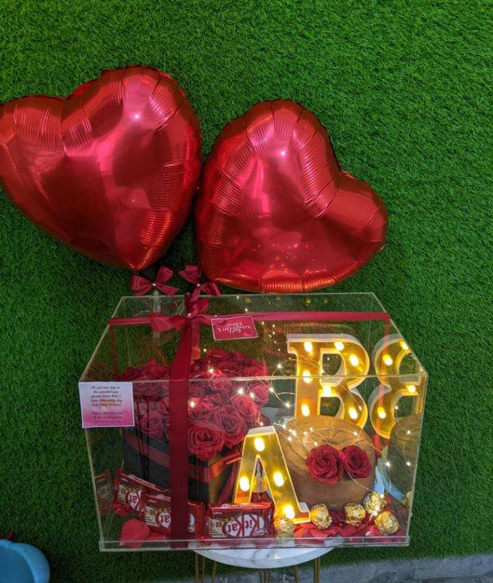 A luxurious romantic gift arrangement featuring double red heart balloons, a stunning rose bouquet, glowing LED alphabet letters, chocolates, and elegant fairy lights—beautifully presented inside a crystal-clear acrylic box. Designed to express love in the most glamorous way, this setup is perfect for anniversaries, proposals, birthdays, or Valentine surprises.