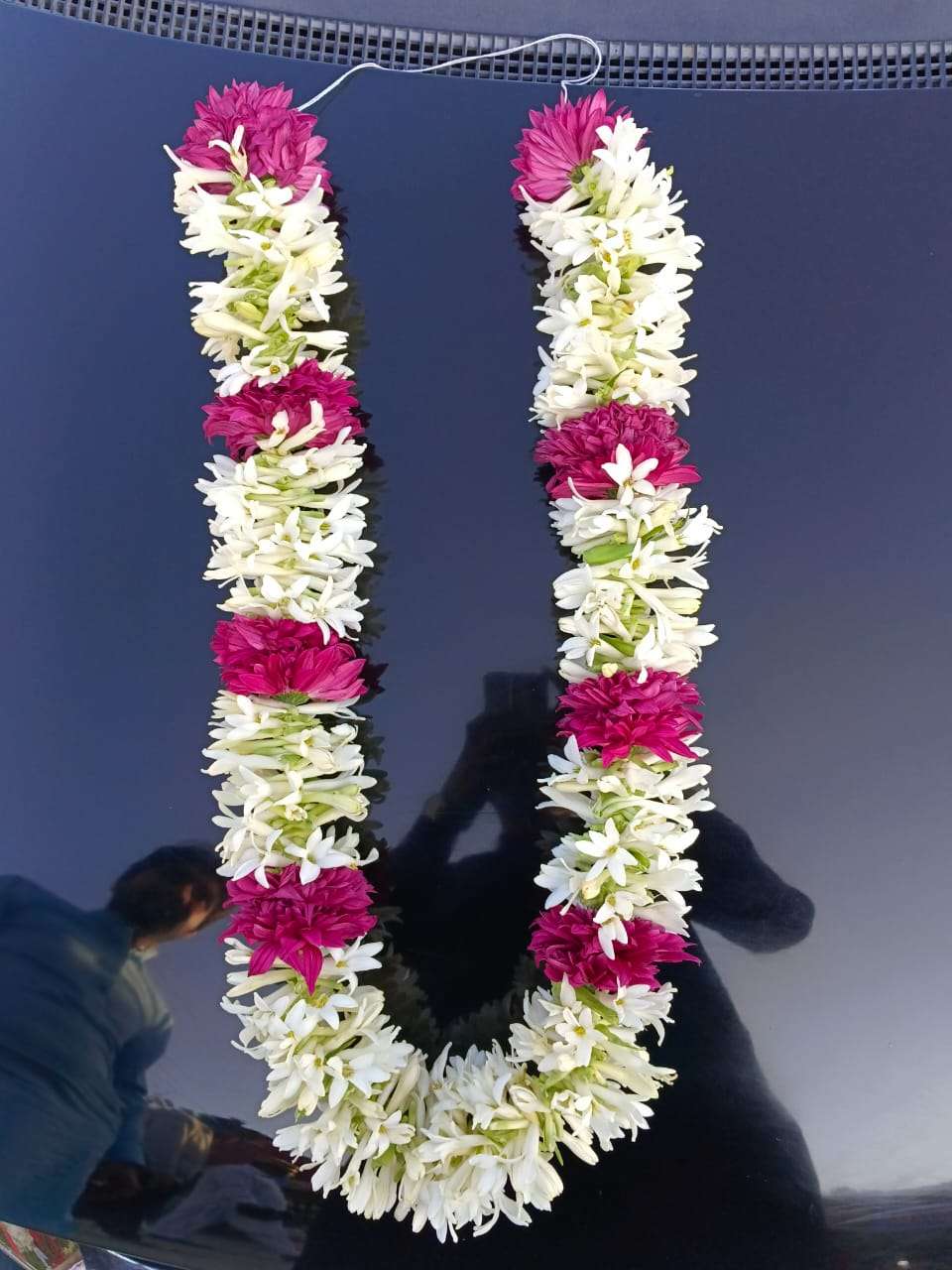 This elegant mala features a beautiful blend of fresh white tuberose and vibrant pink blooms. Handcrafted with care, it offers a rich fragrance and a graceful traditional look. The striking color contrast adds charm and sophistication to any occasion. Perfect for weddings, mehndi, nikah, and cultural celebrations.