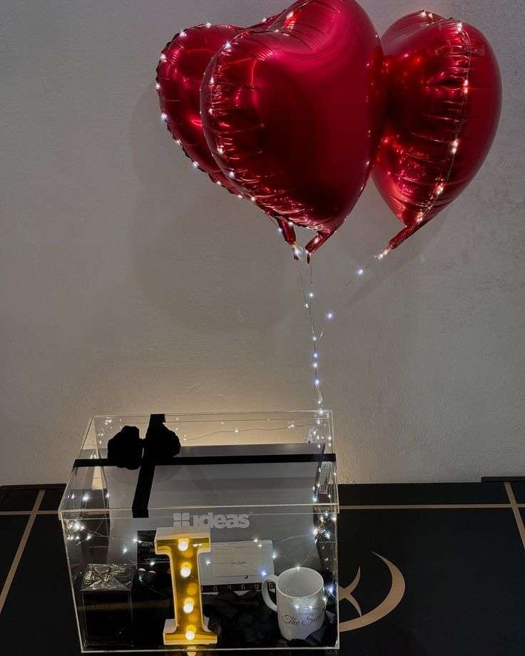 A premium acrylic gift box paired with floating heart balloons and soft lighting, perfect for romantic surprises, luxury gifting, and elegant celebrations.