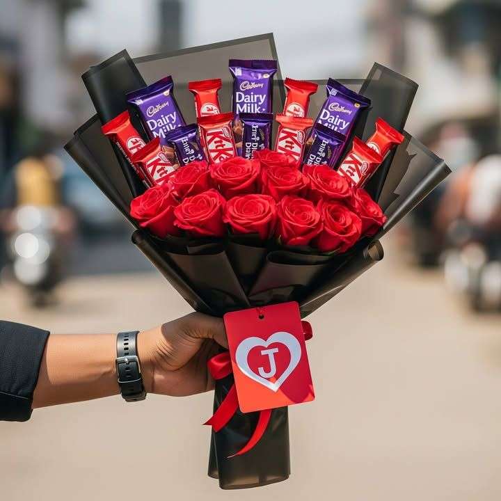 This elegant bouquet combines velvety red roses with delicious chocolate bars, wrapped in luxurious black sheets for a bold and classy look. An ideal gift to express love, admiration, and sweet emotions on any special occasion.