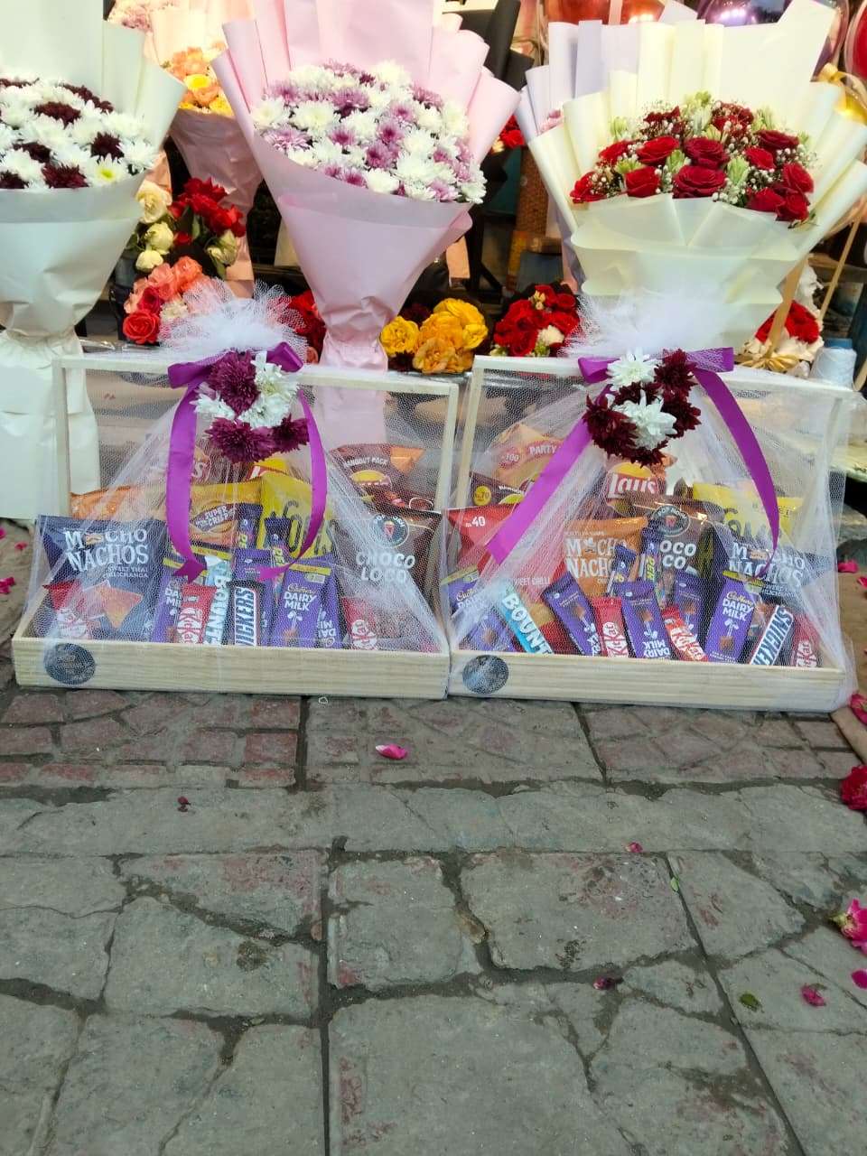 A colorful gift set with a beautiful flower bouquet and a snack-filled basket. Packed with chocolates and crunchy treats, it’s made to bring instant happiness.