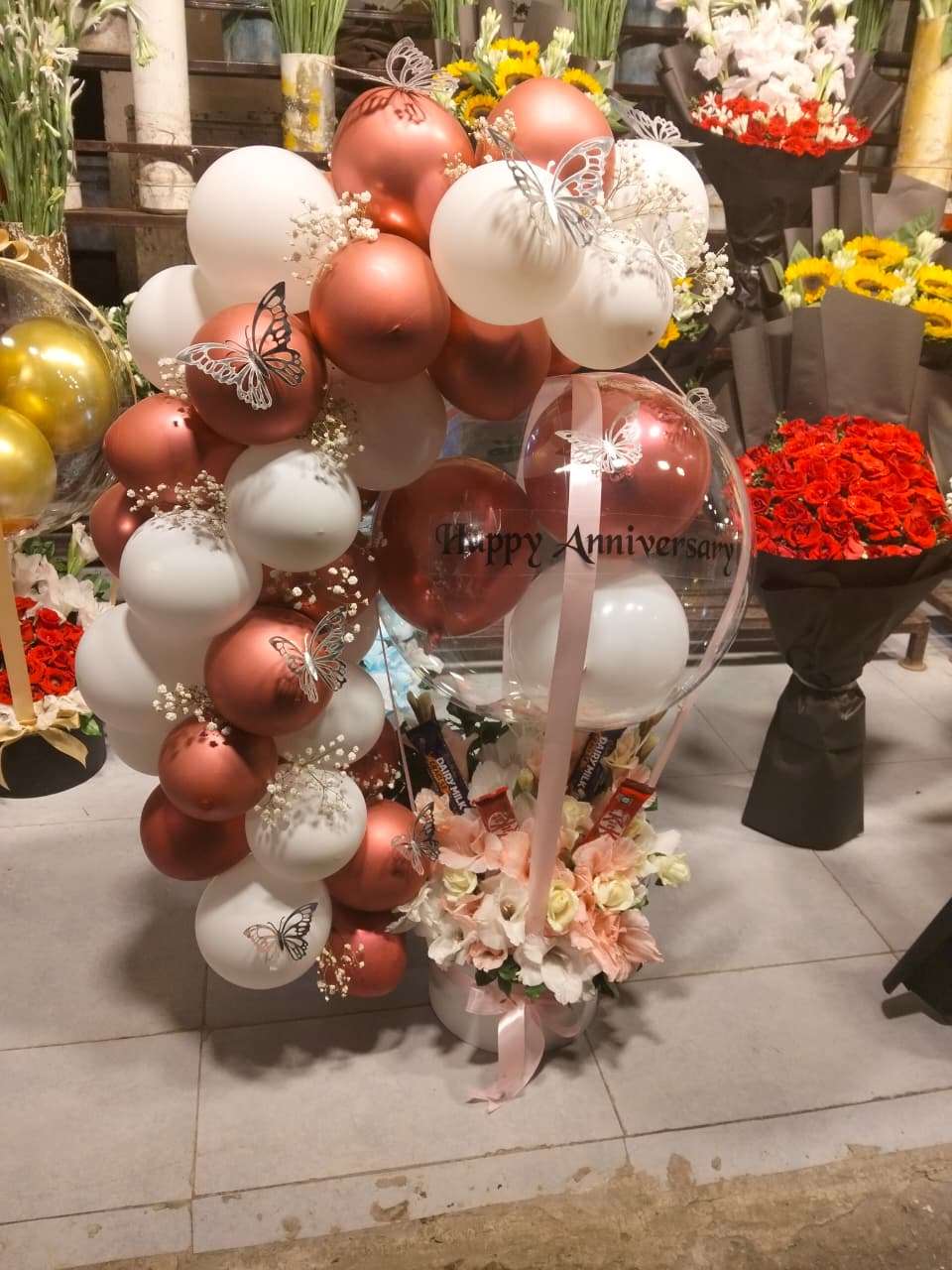 This is a beautiful and very elegant gift that looks like a hot air balloon! It has a base filled with soft pink and cream flowers, along with some chocolates. Rising above it is a huge cloud of rose gold and white balloons, decorated with pretty butterfly stickers. There’s even a clear balloon that says “Happy Anniversary.” This gift is perfect for making someone feel special and celebrated on their anniversary or birthday.