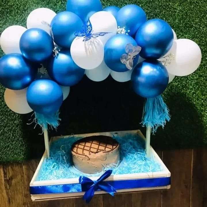 This is a beautiful and thoughtful gift, perfect for an anniversary or a big romantic surprise. You get a lovely bouquet of deep red roses and a bonus small bouquet of chocolates, all wrapped elegantly. The main feature is the clear box that proudly displays a small, personalized cake surrounded by petals and decorations. The whole thing is topped off with fun red star balloons for a grand, celebratory look.