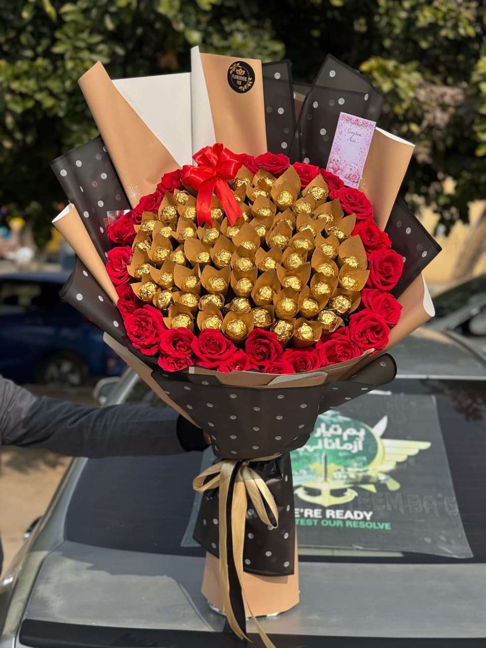 Premium Ferrero Rocher: Over 40 gold-wrapped hazelnut chocolates arranged in a stunning sunburst pattern.