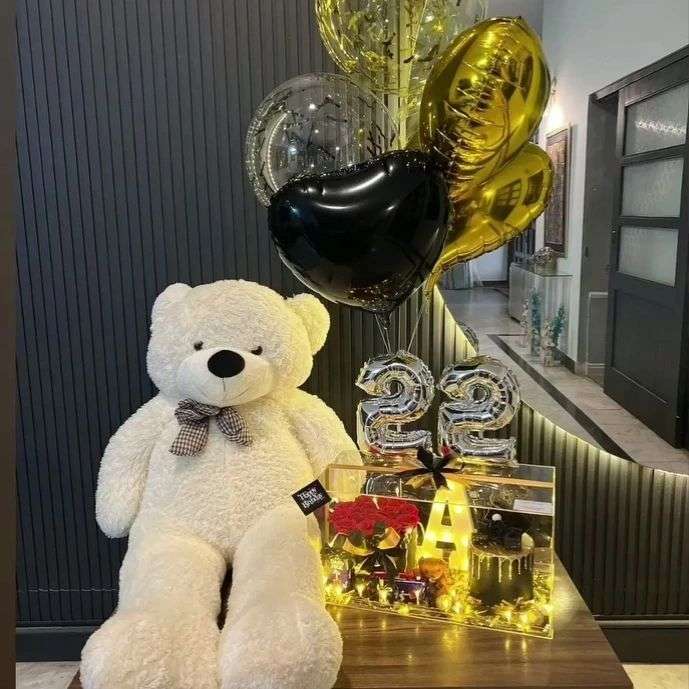 “The Grand Luxe Anniversary Treat” is a sophisticated and lavish surprise designed for a monumental occasion. The centerpiece is a giant, plush white teddy bear symbolizing lasting comfort and affection. It is paired with a stunning, personalized clear acrylic gift box that showcases an arrangement of fresh red roses, a decadent black-themed cake (possibly chocolate), and other luxury sweets. The presentation is completed with a dramatic cluster of black heart, gold foil, and number ’22’ balloons, creating a chic, memorable, and high-impact celebratory statement.