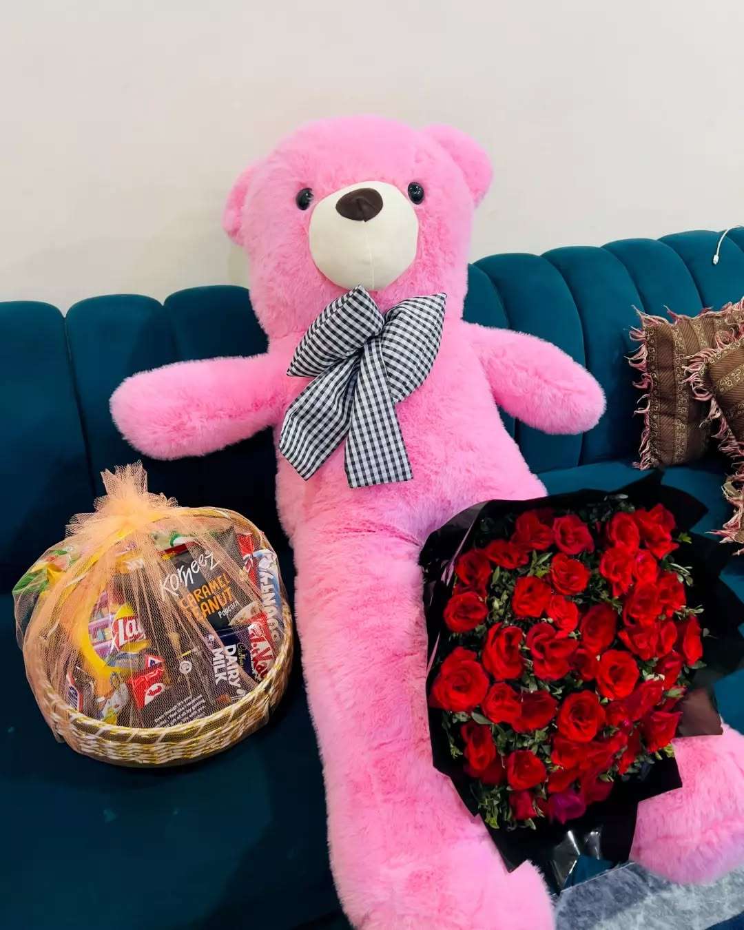 This is a beautiful and thoughtful gift, perfect for an anniversary or a grand romantic surprise. You get a lovely bouquet of deep red roses and a bonus small bouquet of chocolates, all wrapped elegantly. The main feature is the clear box that proudly displays a small, personalized cake, surrounded by petals. The whole thing is finished off with fun, shiny red star balloons for a grand, celebratory look.