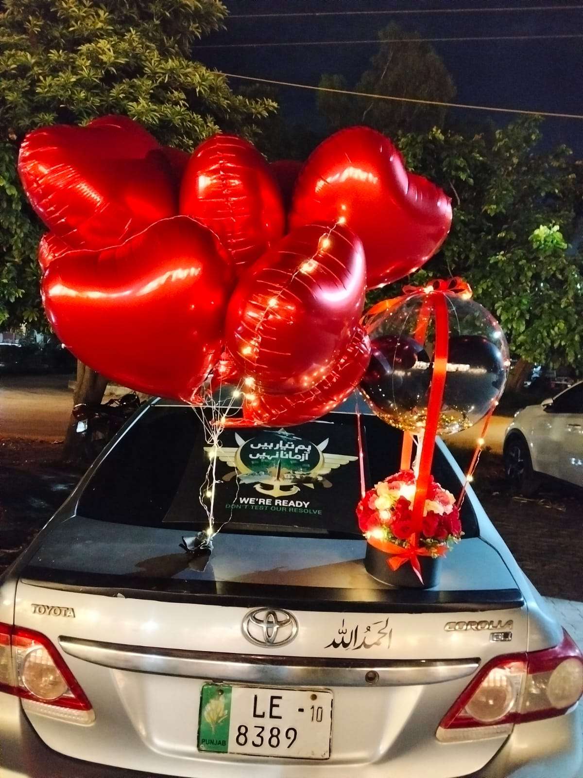 This is a huge, fun, and over-the-top gift! It’s a round box filled with soft pink roses. Rising up from the middle is a tower loaded with tons of chocolates and candies. It’s topped with a big bunch of bright pink balloons and cute little butterflies.
