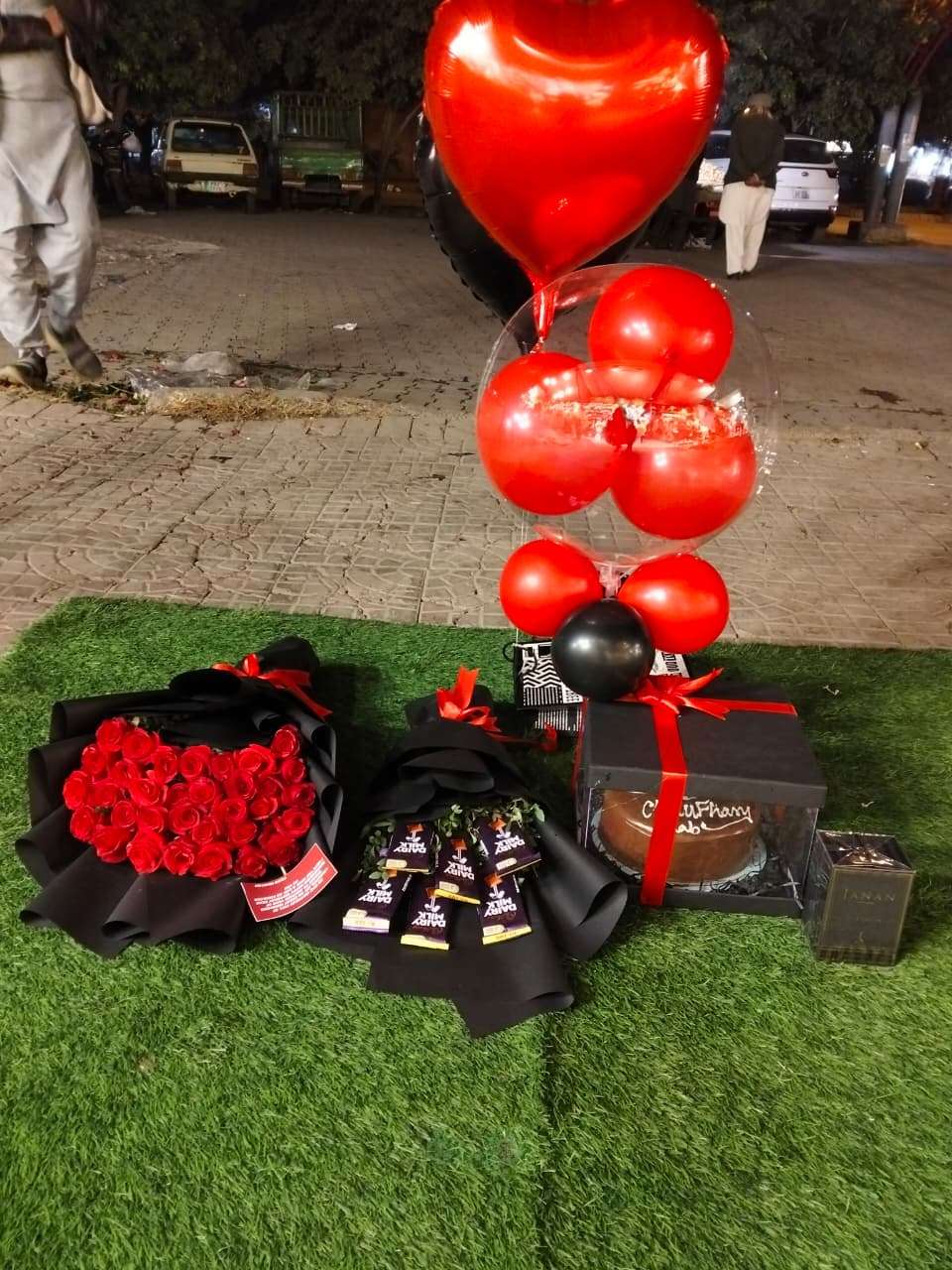 “The Red Rose & Dessert Surprise” is a dramatic, coordinated set of gifts perfect for a romantic surprise or an anniversary. The collection features a large bouquet of deep red roses wrapped in elegant black paper, complemented by a smaller bouquet of chocolates wrapped the same way. The set also includes a decadent chocolate cake in a windowed black box and a sophisticated fragrance, all tied together with bright red ribbons. The scene is finished with a stunning cluster of red, black, and clear heart-shaped balloons, creating a memorable, high-impact romantic display.