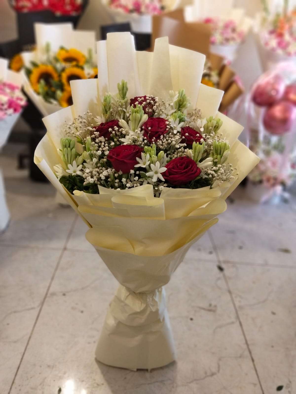 This sophisticated bouquet strikes a perfect balance between bold passion and delicate grace. Featuring deep crimson roses nestled among fragrant white tuberoses and airy baby’s breath, the arrangement offers a stunning contrast of textures and colors. The tuberoses provide a sweet, intoxicating scent that fills the room, while the roses symbolize timeless love. Expertly bundled in a creamy, multi-layered parchment wrap, the bouquet stands with a structural elegance that makes it an ideal centerpiece or a premium gift. Whether it is for an anniversary, a celebration, or a heartfelt “thank you,” this arrangement is designed to leave a lasting impression of luxury and warmth.