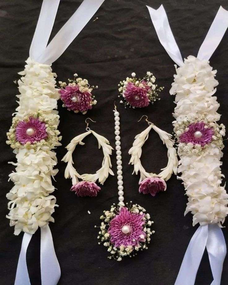 Graceful white florals accented with purple blooms and pearl details. A complete floral jewelry set including gajra, earrings, and necklace. Perfect for mehndi, mayoon, and bridal festivities. Fresh, lightweight, and handcrafted for elegance.
